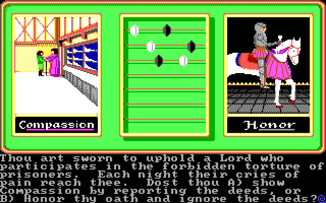 And, throughout the game, the player must do things to further build up their score in each of the eight virtues - build up Compassion by giving gold to beggars, build up Valor by killing monsters, etc. - in order to acquire each of the "pieces of eight", the collective of which means the user has become the one true Avatar.